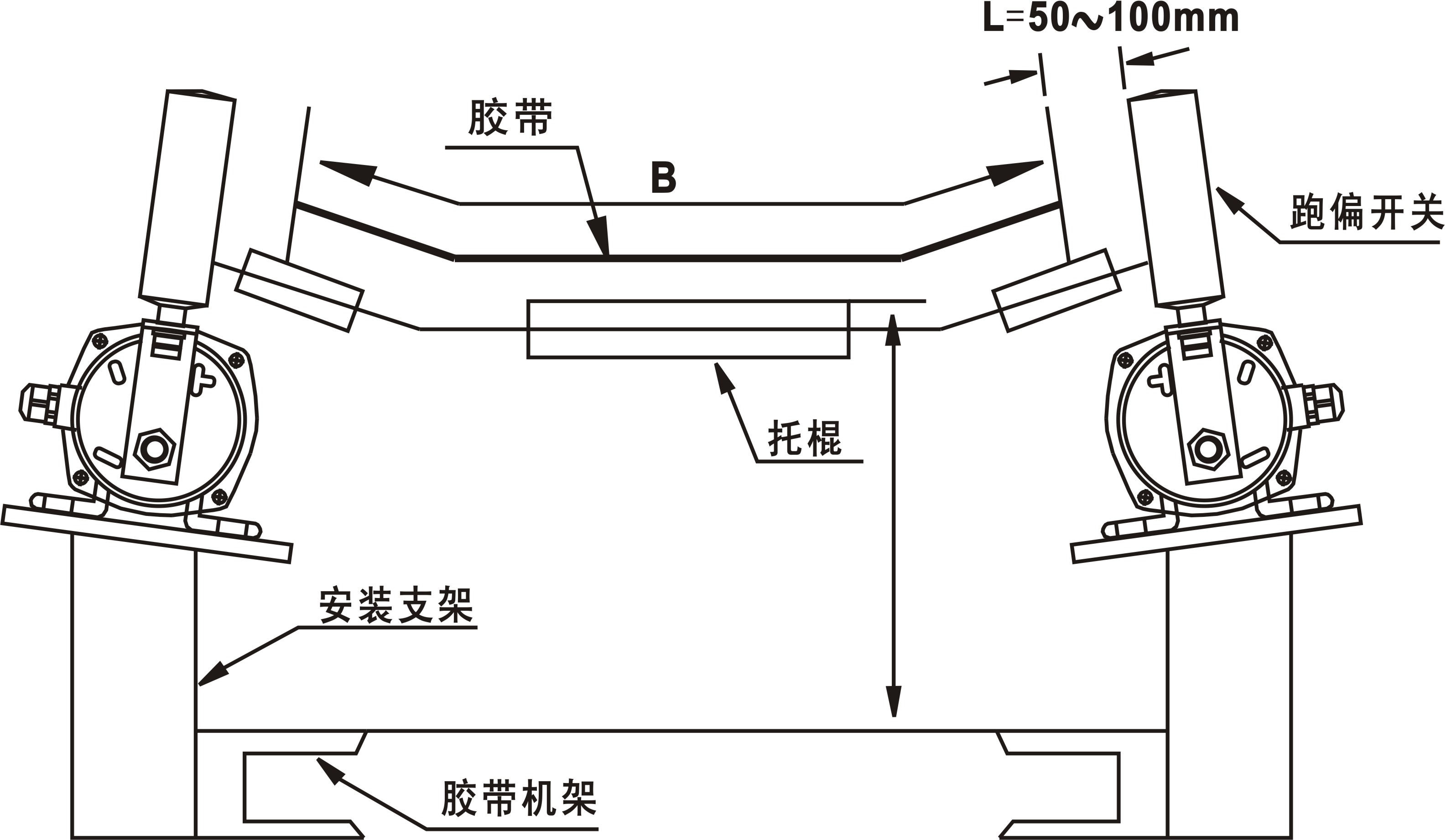 4.跑偏開關(guān)應(yīng)通過安裝支架與輸送機中間架連接,開關(guān)支架應(yīng)在輸送機安裝完成后與輸送機機架焊接,跑偏開關(guān)與跑偏開關(guān)支架用螺栓固定。